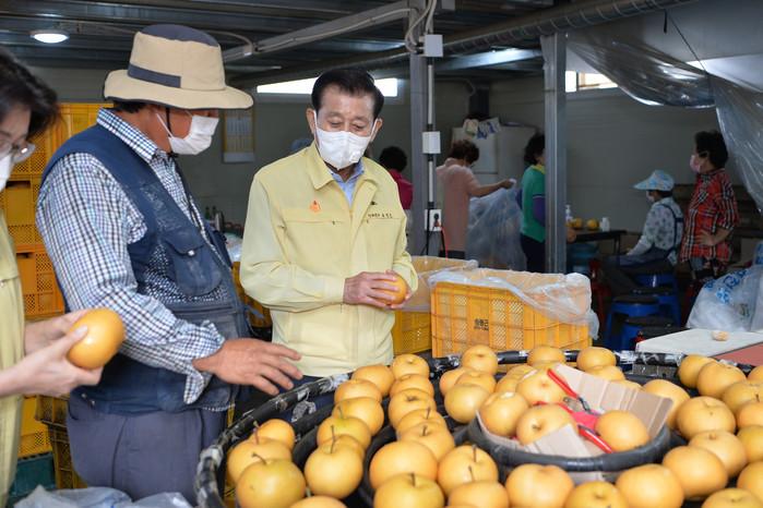 인천 강화군에서 출하한 ‘강화섬 해풍배’가 대만 수출길에 올랐다. 품종은 원황으로 수출선과장에서 당도·무게 등 엄격한 기준으로 선별해 검역검사를 통과했다. 사진은 유천호 군수(오른쪽)가 수출 전 선과 작업을 살펴보는 모습. (사진제공=강화군청)