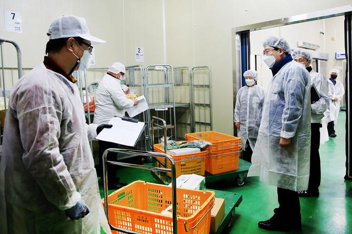 맹정호 충남 서산시장이 5일 서산시학교급식지원센터를 방문해 식재료 공급상황을 점검했다. 이날 맹 시장은 이른 시간 식재료 출하상태를 점검하는 관계자와 배송 관계자들을 격려하고 업무의 차질 없는 수행을 당부했다. 사진은 맹 시장이 서산시학교급식지원센터를 점검하고 있는 모습. (사진제공=서산시청)