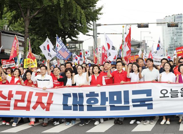 황교안 대표, 나경원 원내대표를 비롯한 의원들이 24 오후 서울 종로구 세종문화회관 앞에서 열린 문재인 대통령 규탄 시위를 마치고 청와대로 행진하고 있다. 대표는 “우리 모두가 꿈꾸는 미래, 정의롭고 공정한 사회, 자유가 넘치는 대한민국으로 함께 바꿔가자”고 말했다.