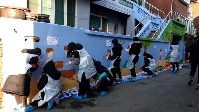 서울 금천구는 지난 14일 동양미래대학교 산·학협력단과 연계해 기쁨나무장애인작업장 공동생활가정인 ‘기쁨이싹트는나무’에 벽화 봉사활동을 진행했다. 이번 봉사활동에는 동양미래대학교 산·학협력단, 실내환경디자인과 교수 및 학생 20명이 참여해 ‘기쁨이싹트는나무’ 내·외벽, 다락방, 창고 등 약 30~40m 벽화 그리기를 진행했다. 사진은 참여자들이 벽화를 그리고 있는 모습. (사진제공=금천구청)