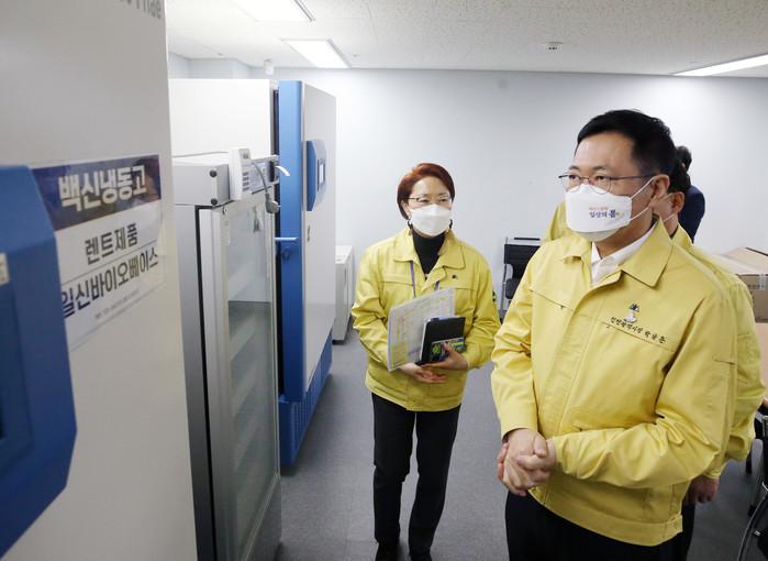 15일 오전 인천 연수구 선학체육관에 마련된 코로나19 예방접종센터에서 박남춘 인천시장이 백신 냉동고를 점검하고 있다.