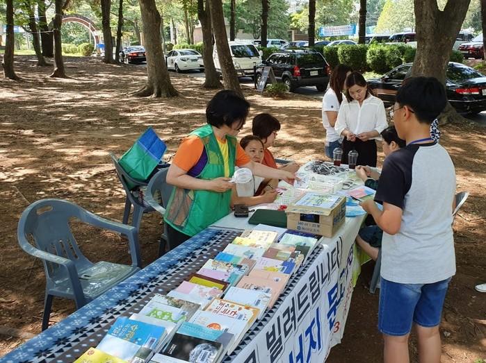 경기 수원시 권선구 새마을문고회는 최근 서둔동 경기상상캠퍼스에서 '피서지 새마을문고'를 운영했다. 사진은 새마을문고회 관계자들이 도서 무료 대여를 진행하고 있는 모습.(사진제공=권선구청)