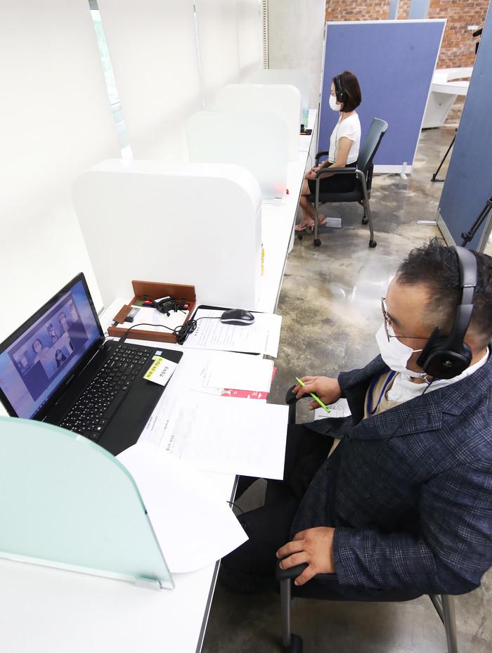 1일 오전 경기 안산시 단원구 안산중앙도서관에 설치된 안산시 공무원 공개경쟁임용 화상면접시험장에서 관계자들이 비대면 면접 시연을 하고 있다.