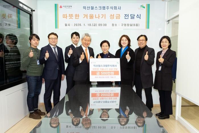 서울 은평구가 최근 익산철스크랩주식회사로부터 지역내 저소득 주민 지원을 위한 성금 500만원을 전달받았다. 이번에 전달받은 성금은 저소득 주민생활 지원을 위해 사용될 예정이다. 사진은 김미경 구청장(오른쪽에서 네 번째)이 성금을 전달받고 기념촬영을 하고 있는 모습. (사진제공=은평구청)