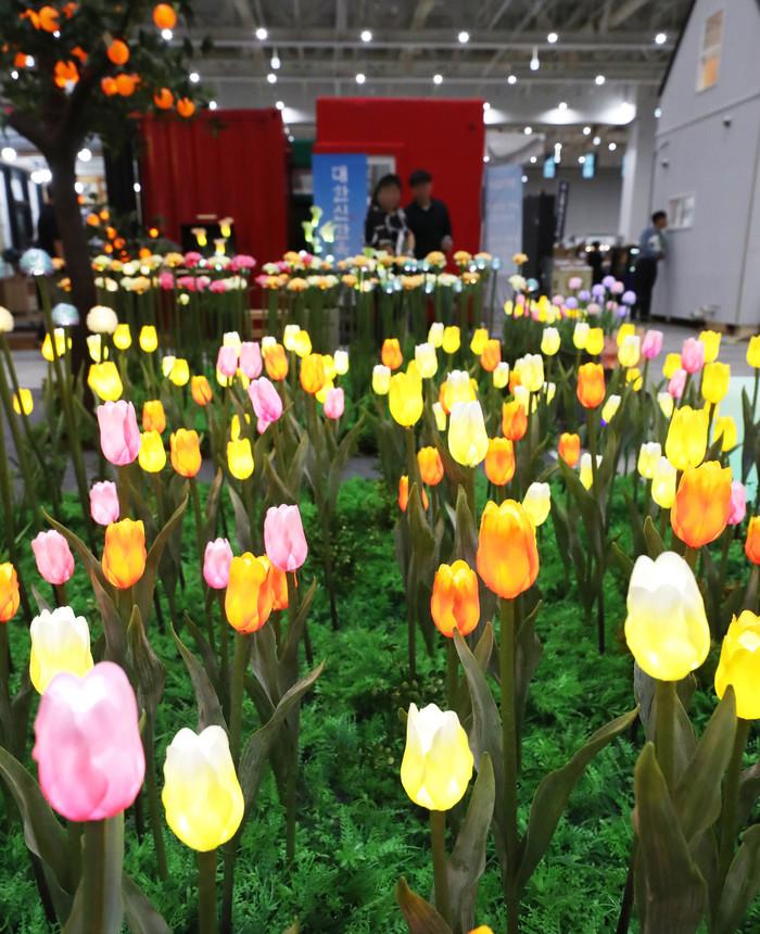 5일 오후 경기 수원시 영통구 수원컨벤션센터에서 열린 '2019 조경·정원환경 박람회'를 찾은 관람객들이 다양한 LED플라워를 살펴보고 있다.