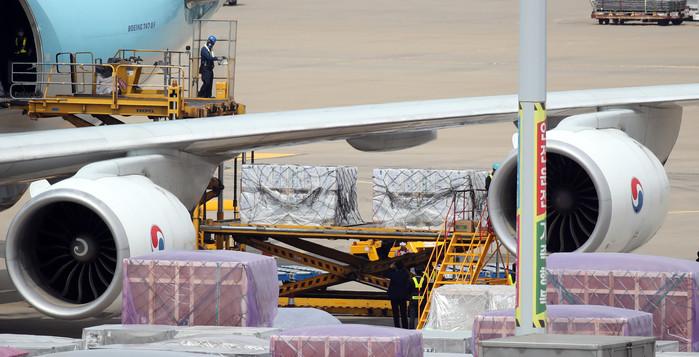 4일 영종도 인천국제공항 화물터미널에서 관계자들이 우리 정부가 미국 제약사 화이자와 직접 계약한 코로나19 백신 253만회분을 화물기에서 내리고 있다.