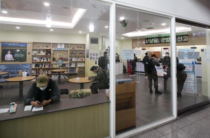 17일 수도권과 강원 지역내 '군부대내 거리두기'가 1.5단계로 격상됐다. 국방부에 따르면 수도권과 강원 지역 부대원들은 17일부터 오는 29일까지 유흥시설 출입이 금지된다. 사진은 이날 서울역 내 여행 장병안내소(TMO)를 이용하는 장병들의 모습.