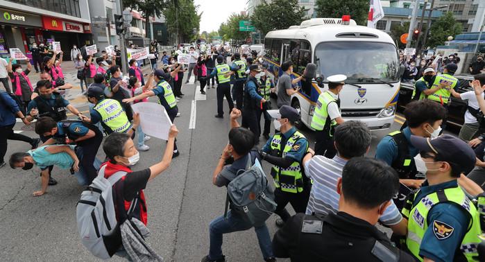 민주노총 조합원들이 6일 오전 서울 종로경찰서 앞 도로에 양경수 전국민주노동조합총연맹(민주노총) 위원장의 검찰 송치에 반대하며 진입하자 경찰이 이를 막으며 양 위원장이 탄 호송차를 안내하고 있다.