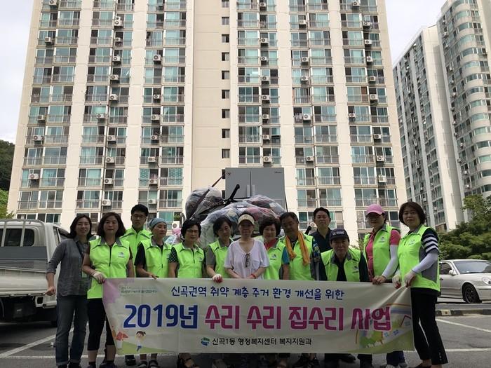 경기 의정부시 신곡1동 행정복지센터 복지지원과는 27일 희망넝쿨단 넝쿨지기와 함께 강제 퇴거 명령을 받은 위기가구에 대해 이사지원 서비스를 실시했다. 사진은 참여자들이 기념촬영을 하는 모습. (사진제공=의정부시청)