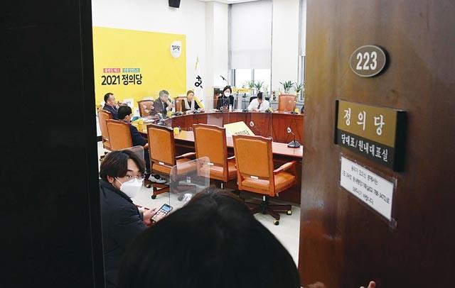 정의당 김종철 대표가 장혜영 의원을 성추행한 사실을 인정하고 대표직을 사퇴한 25일 서울 여의도 국회 정의당 당대표실에서 부대표단이 모여 비공개 대표단회의를 하고 있다.