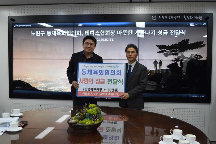 서울 노원구는 11일 구청장실에서 동 체육협의회와 노원구 테니스협회장으로부터 어려운 이웃을 위한 '따뜻한 겨울나기 사랑의 성금' 100만원을 각각 기탁받았다. 사진은 오승록 구청장(왼쪽)과 체육협의회 회장이 기념촬영을 하는 모습. (사진제공=노원구청)