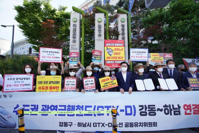 한편 구는 그동안 GTX-D 강동구 경유를 위해 2020년 3~8월 주민서명운동을 실시, 10만명 이상의 주민 동참을 이끌어냈으며, 자체적으로 '강동구 GTX-D 도입 연구용역'을 시행하고 국토교통부에 GTX-D 강동구 경유를 건의해 왔다.