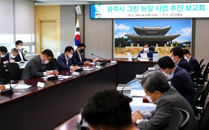 경기 광주시가 6일 시청 상황실에서 신동헌 시장을 비롯해 관계 부서장 및 광주도시관리공사 등 30여명이 참석한 가운데 '광주시 그린뉴딜 사업 추진 보고회'를 열고 광주형 그린뉴딜 사업을 발굴, 보고했다. 사진은 신 시장이 회의를 주재하는 모습. (사진제공=광주시청)