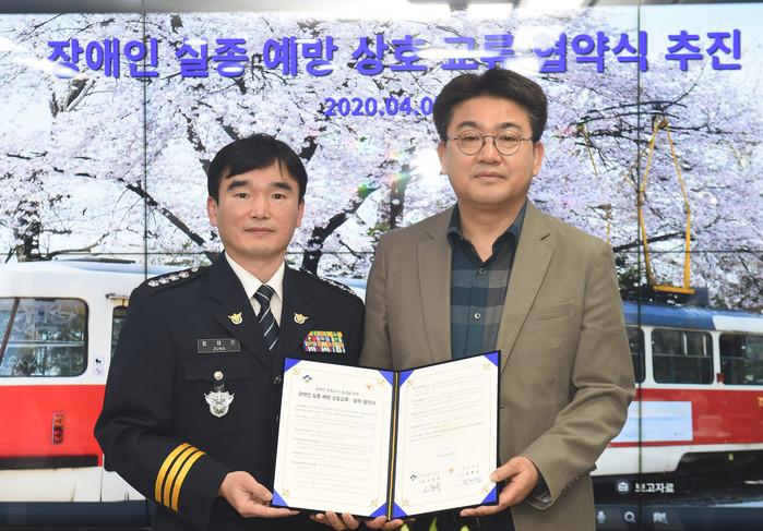 서울 노원구가 9일 구청장실에서 노원경찰서와 장애인 실종 예방 상호 교류 협약식을 개최했다. 이날 오승록 구청장과 노원경찰서장, 노원구 장애인 총연합회 회장 등이 참석했다. 사진은 오 구청장(오른쪽)과 노원경찰서장이 기념촬영을 하는 모습.(사진제공=노원구청)