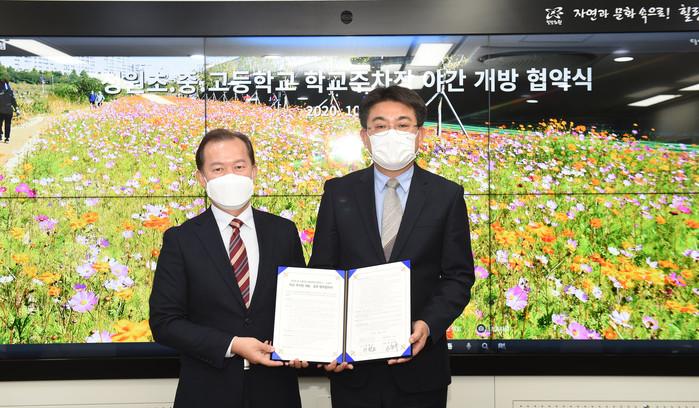 노원구는 지난 27일 청원초·중·고등학교·청원여자고등학교와 학교주차장 야간개방 협약식을 했다. 이 협약으로 학교는 주차장 22면을 평일에는 오후 6시~다음날 오전 7시30분, 토·일요일과 공휴일은 24시간 개방한다. 사진은 협약식에서 오승록 구청장(오른쪽)과 이한도 청원고등학교 교장이 기념촬영을 하는 모습. (사진제공=노원구청)