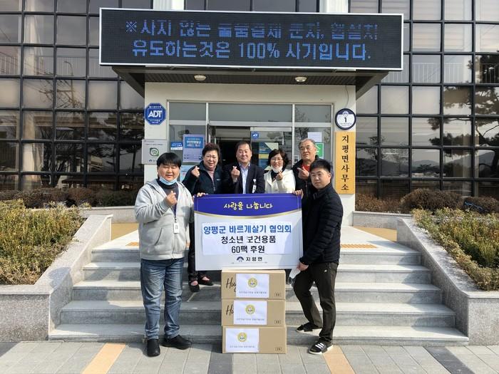 경기 양평군 바르게살기협의회는 2일 지평면 사무소에 여성용품 20개씩 3상자, 총 60개를 후원했다. 이날 기탁된 여성용품은 지역내 저소득계층 가구 청소년들에게 전달될 예정이다. 사진은 전달 후 함께 기념촬영을 하는 모습. (사진제공=양평군청)
