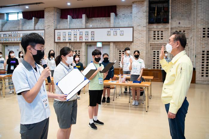 경북 구미시가 28일 시청 4층 대강당에서 아동의 참여권 보장과 아동 의견을 대변하기 위한 '제4기 구미시 아동참여위원' 35명을 대상으로 위촉식을 개최했다. 위촉된 위원들은 앞으로 아동이 건강하고 행복하게 자랄 수 있는 환경을 조성하기 위한 의견을 정책에 반영하기 위해 활동한다. 사진은 이날 위촉된 아동참여 대표위원들이 장세용 시장(오른쪽) 앞에서 활동다짐 선서를 하고 있는 모습. (사진제공=구미시청)