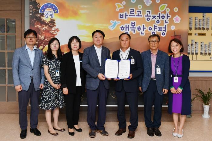 경기 양평군은 최근 군수 집무실에서 정동균 군수를 비롯해 관계자 등이 참석한 가운데 NH농협은행 양평군지부와 '양평愛 청년통장' 사업 운영지원을 위한 업무협약을 체결했다. 사진은 협약 후 정 군수(오른쪽에서 세 번째)와 관계자들의 기념촬영 모습. (사진제공=양평군청)