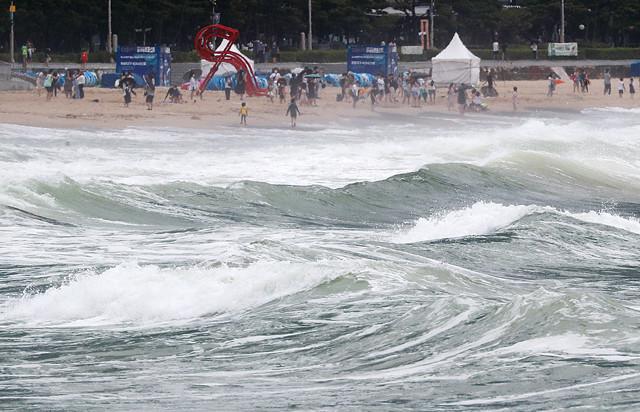 계속되는 집중호우로 큰 피해를 입고 있는 부산 지역에 태풍 ‘장미’가 북상하면서 추가 피해가 우려되는 가운데 10일 오후 부산 해운대해수욕장에 높은 파도가 일자 입욕이 통제되고 있는 모습이다. 한편 부산 지역에는 오전 이날 오전 10시20분께부터 비가 내리기 시작했다.