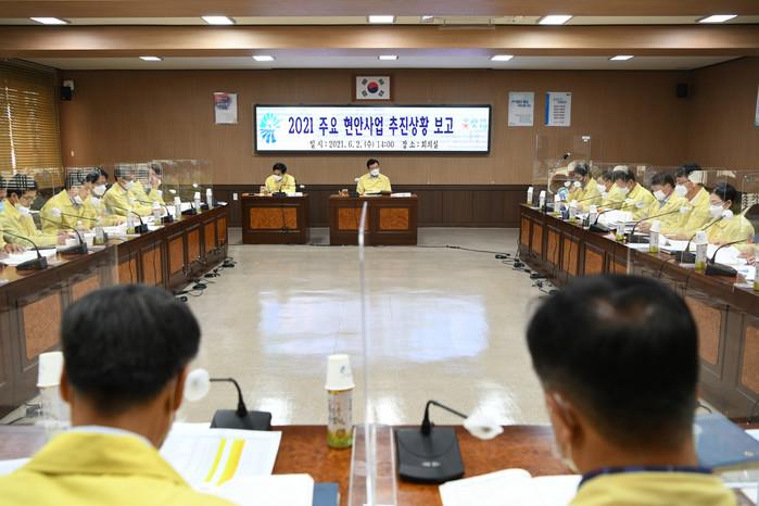 충남 홍성군이 최근 군청 회의실에서 김석환 군수와 길영식 부군수를 비롯한 각 국장·직속기관장, 담당관·과장·사업소장이 참석한 가운데 2021년 주요 현안사업 추진상황 보고회를 개최했다. 이날 보고회에서는 ▲충남혁신도시 이전 공공기관 유치 ▲충남혁신도시 내포캠퍼스 설립 ▲홍성형 유기농 프로젝트(지역발전투자협약) 등 70건의 주요 현안사업에 대한 추진 방안이 심도 있게 논의됐다. 사진은 김석환 군수(가운데) 및 참여자들이 회의하는 모습. (사진제공=홍성군청)