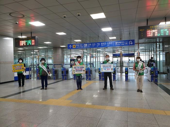 코로나19 재확산으로 강화된 사회적 거리두기 2단계가 시행된 가운데 최근 경기 의정부시 새마을회가 시 전지역에서 '마스크 착용 생활운동 캠페인'을 전개했다. 사진은 이날 회원들이 의정부역에서 열차 이용객들을 대상으로 마스크 착용을 홍보하는 모습. (사진제공=의정부시청)
