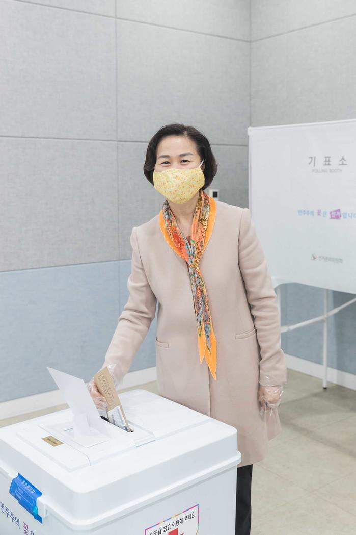 김수영 서울 양천구청장이 '제21대 국회의원선거' 사전투표 첫날인 10일 오전 신정6동 주민센터에 마련된 사전투표소를 방문해 투표를 했다. 사진은 투표함에 투표용지를 넣고 있는 김 구청장의 모습.(사진제공=양천구청)