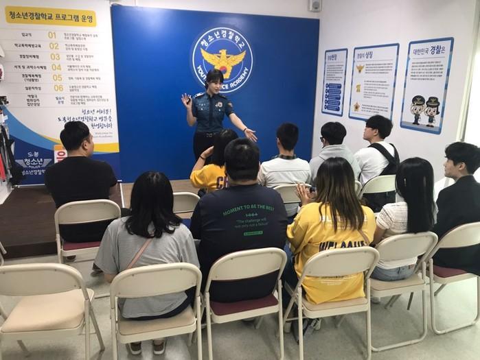 | ▲ 꿈드림 참여 청소년들이 도봉청소년경찰학교를 방문해 교육을 받는 모습. (사진제공=강북구청) |