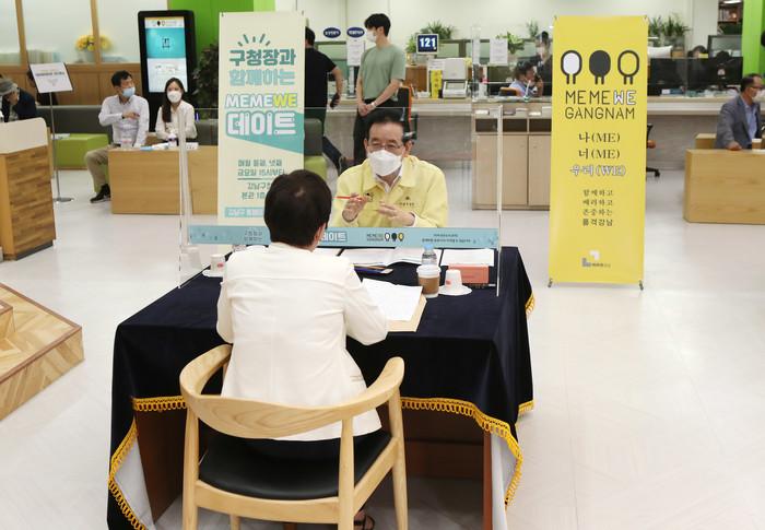 정순균 강남구청장은 최근 구청본관에서 열린 ‘미미위데이트’에 참여해 구민과 1대1로 구정 발전방향을 논의하고 있다. 미미위데이트에서는 강남구민이면 누구나 생활불편·민원사항 상담 및 구정 발전을 위한 정책제안을 할 수 있다.