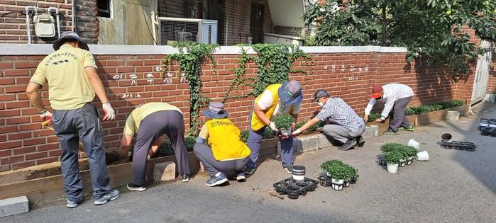 경기 광주시 경안동 행복마을관리소는 최근 추석 명절을 앞두고 골목 화단에 국화를 식재하는 아름다운 골목정원 조성과 깨끗한 거리 환경정화 활동을 추진했다. 사진은 관리소 종사자들이 국화를 식재하고 있는 모습. (사진제공=광주시청)