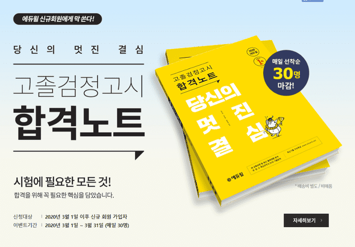 [시민일보 = 황혜빈 기자] 종합교육기업 에듀윌(대표 박명규)은 고졸 검정고시 시험 합격을 위해 필요한 핵심을 담은 '고졸검정고시 합격노트' 교재를 무료로 제공하는 이벤트를 진행한다고 밝혔다.