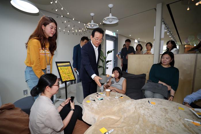 정순균 강남구청장이 지난 8일 강남구 개포로 개포디지털혁신파크내 무중력지대 강남에서 열린 ‘무중력지대 강남 개관식’에 참석했다. 사진은 '휴식'을 테마로 대화하는 소규모 네트워킹 프로그램인 노 그래비티 네트워킹(No Gravity Networking)에 참여하고 있는 정 구청장의 모습. (사진제공=강남구청)