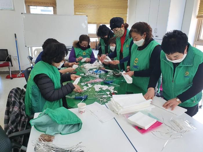 최근 경기 의정부시 가능동 새마을부녀회가 코로나19 예방을 위해 키친타월로 직접 제작한 일회용 마스크 100장을 동주민센터 맞춤형복지팀에 기탁했다. 마스크는 지역내 취약계층에 전달될 예정이다. 사진은 마스크를 만드는 부녀회원들의 모습. (사진제공=의정부시청)