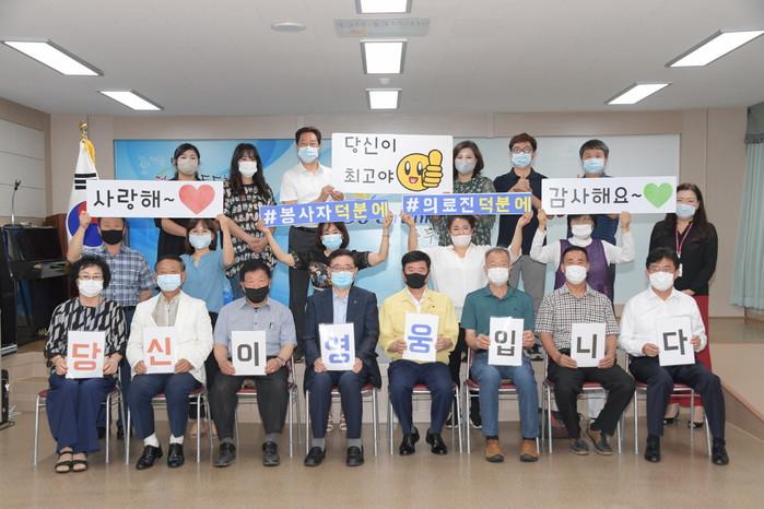 경기 동두천시자원봉사센터이사회가 27일 오전 두드림희망센터에서코로나19 확산 방지와 환자 치료를 위해 애쓰고 있는 의료진과 지역내 자원봉사자들을 격려하는‘덕분에 챌린지’ 캠페인에 동참했다. 사진은 응원메시지가 적힌 플래카드를 들고 있는 캠페인 참가자들의 모습. (사진제공=동두천시청)