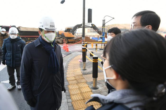 윤화섭 경기 안산시장은 14일 상록구 사동 상가신축공사장에서 발생한 흙막이 붕괴사고 현장을 찾아가 인근 주민들에게 신속한 복구를 약속했다. 사진은 윤 시장이 현장과 인접한 아파트 주민을 대상으로 추가 사고 예방 및 복구를 위해 시가 추진 중인 사안을 설명하는 모습. (사진제공=안산시청)