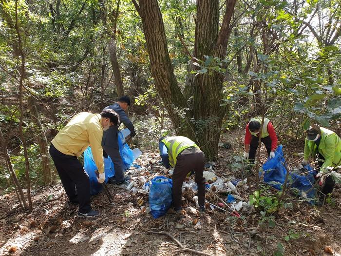 경기 남양주시 진건퇴계원행정복지센터는 지난 5일 추석연휴 기간 공동묘지 주변에 버려진 성묘 쓰레기를 수거하는 활동을 전개했다. 사진은 이날 참여자들이 성묘객들이 버린 쓰레기를 수거하고 있는 모습. (사진제공=남양주시청)