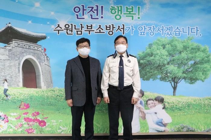 김용덕 경기 수원시 영통구청장이 11일 수원남부소방서를 비롯해 국토지리정보원, 수원가정법원 등 주요 유관기관을 방문해 구정발전을 위한 소통을 이어갔다. 사진은 김 구청장(왼쪽)이 수원남부소방서장과 기념촬영을 하는 모습. (사진제공=영통구청)