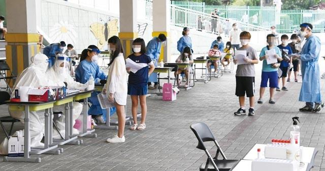 28일 서울 관악구 난우초등학교에 마련된 선별진료소에서 학생들이 신종 코로나바이러스 감염증(코로나19) 검사를 받기 위해 기다리고 있다. 지난 26일 코로나19 확진 판정을 받은 왕성교회 신도 중 난우초등학교 시간강사가 확진 판정을 받아 난우초는 오는 29일 하루 등교를 중지키로 했다.