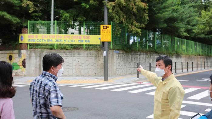 경기 수원시 장안구는 최근 안전한 도로환경 조성을 위해 불법 주·정차 민원 다발지역인 율전 초등학교 후문 등 지역내 5곳을 현장점검했다. 사진은 이날 왕철호 구청장(오른쪽)이 점검반과 함께 현장을 살펴보고 있는 모습. (사진제공=장안구청)