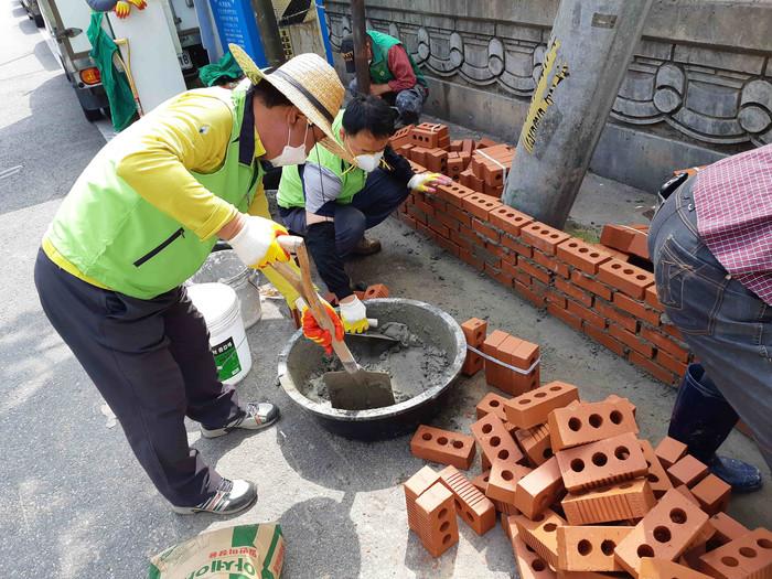 인천 미추홀구 용현1·4동 행정복지센터는 '2020 청결지킴이 사업' 일환으로 경인북길 일대 쓰레기 상습 무단투기 지역 3곳에 ‘게릴라 가든’을 조성했다. 사진은 용현1·4동 주민자치회와 새마을협의회 회원 10여명이 벽돌을 쌓아 화단을 만들고 있는 모습. (사진제공=미추홀구청)