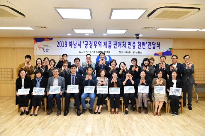 경기 하남시가 14일 시청 상황실에서 '공정무역 제품 판매처 인증 현판 전달식'을 개최했다. 이날 전달식에는 김상호 시장을 비롯해 제품 판매처 대표 등 20여명이 참석해 11개 판매처에 인증 현판을 전달했다. 사진은 기념촬영 모습. (사진제공=하남시청)