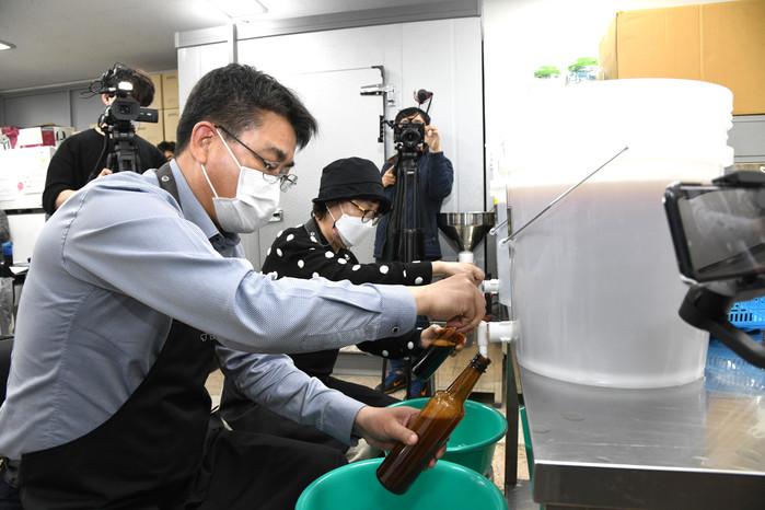 | ▲ 노원평생시민대학 수제맥주 만들기 종강식에 참석한 오승록 구청장(왼쪽)이 양조실습에 참여하고 있는 모습. (사진제공=노원구청) |