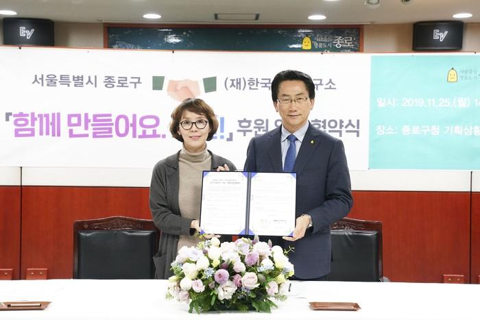 25일 서울 종로구가 구청 기획상황실에서 (재)한국의학연구소와 저소득 취약계층의 생활 안정과 교육·문화 등을 지원하기 위한 ‘함께 만들어요. 내일! 업무협약’을 맺었다. 사진은 협약 후 기념촬영을 하고 있는 김영종 구청장(오른쪽)과 김순이 한국의학연구소 이사장의 모습. (사진제공=종로구청)