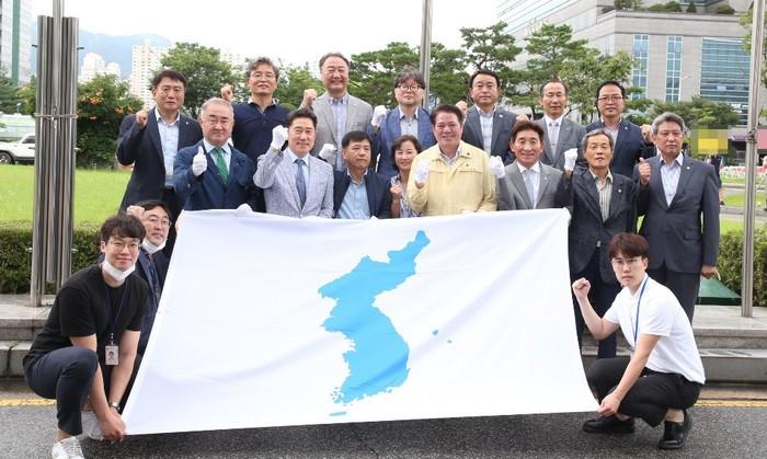 경기 안양시는 11일 시청앞 광장 국기게양대에 남북평화의 상징인 한반도기를 게양했다. 제75주년 광복절을 맞아 한반도의 평화와 번영을 염원하자는 의미에서 이달 말까지 한반도기를 게양하기로 했다. 사진은 최대호 시장과 관계자들이 게양식에서 기념촬영을 하고 있는 모습. (사진제공=안양시청)