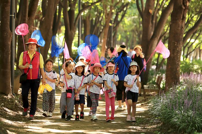 서울 성동구는 여름방학을 맞이해 최근 송정제방산책로에서 '매미 학습교실'을 운영했다. 이날 어린이들은 숲해설가의 해설을 들으며 매미를 채집하고 관찰 후 자연으로 다시 돌려 보냈다. 사진은 매미 학습교실에 참여한 어린이들의 모습. (사진제공=성동구청)