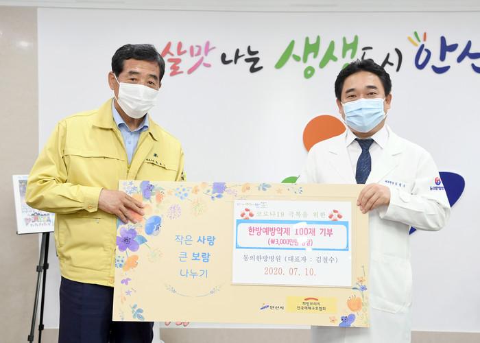 경기 안산시가 최근 동의한방병원으로부터 코로나19 확산 방지와 노인 건강 증진을 위한 청폐배독탕 50재와 옥병풍산 50재 등 면역력 강화에 효과가 있는 한방예방약제 100재(3000만원 상당)를 기탁받았다. 사진은 전달식에서 윤화섭 시장(왼쪽)과 김철수 대표원장이 기념촬영을 하는 모습. (사진제공=안산시청)