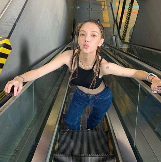 지민은 민소매 크롭티를 입고 늘씬한 자태를 뽐내고 있다. 특히 그녀의 옆구리에 새겨진 딸기 모양 타투가 눈길을 끈다.