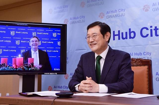 이용섭 시장은 3일 오후 시청 비즈니스룸에서 부르크하르트 융 독일 라이프치히 시장과 1시간에 걸친 영상회의를 갖고 코로나19 대응 전략과 그린뉴딜 정책 등 경제·문화·인권 등 분야별 협력방안을 논의했다.