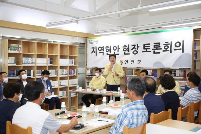 27일 경기 연천군은 청산면 궁평 권역의 활성화를 위한 지역 현안 현장토론회를 열고, 현장의 다양한 의견을 청취했다. 사진은 토론회에서 김광철 군수가 발언하고 있는 모습. (사진제공=연천군청)