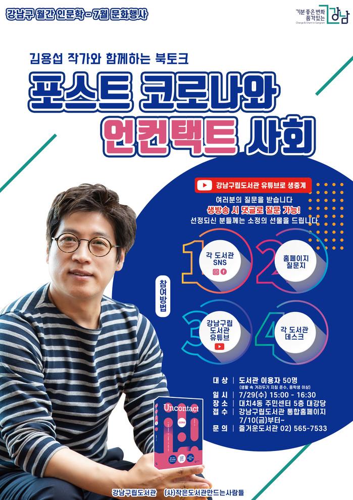 [시민일보 = 이대우 기자] 서울 강남구(구청장 정순균)가 29일 대치4문화센터 5층 대강당에서 ‘언컨택트(더 많은 연결을 위한 새로운 시대 진화 코드)’ 저자 김용섭 작가를 초청해 온·오프라인 실시간 북토크를 개최했다.