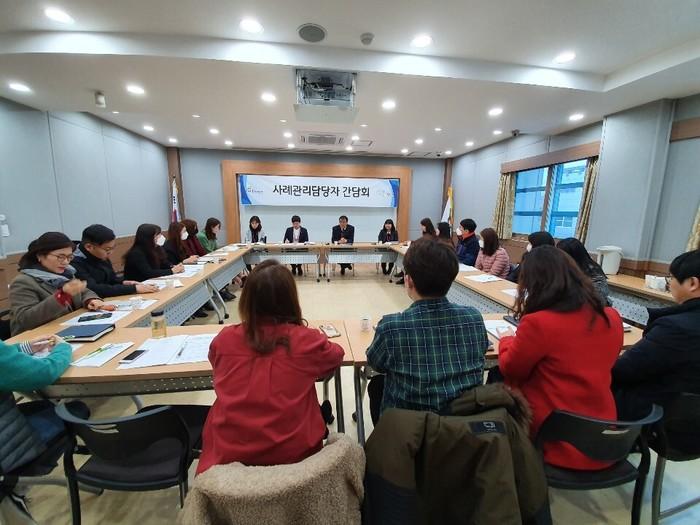 경기 동두천시 무한돌봄센터는 최근 시청 소회의실에서 '통합사례관리 담당자 간담회'를 개최했다. 이날 간담회에는 무한돌봄센터를 비롯한 8개동 행정복지센터 사례관리 실무자 등 21명이 참석한 가운데 2019년 통합사례관리 사업 추진실적을 공유하고, 2020년 사례관리 활성화 방안을 심도 있게 논의했다. 사진은 참여자들이 회의하는 모습. (사진제공=동두천시청)